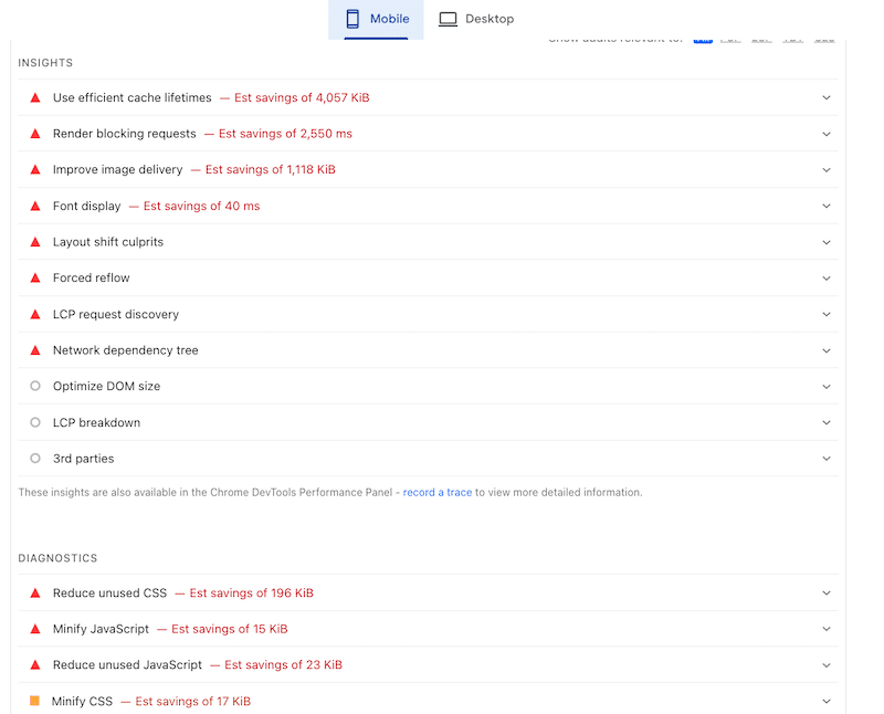 Below are the performance issues flagged by Lighthouse, listed under the “Insights” and “Diagnostics” tab:
