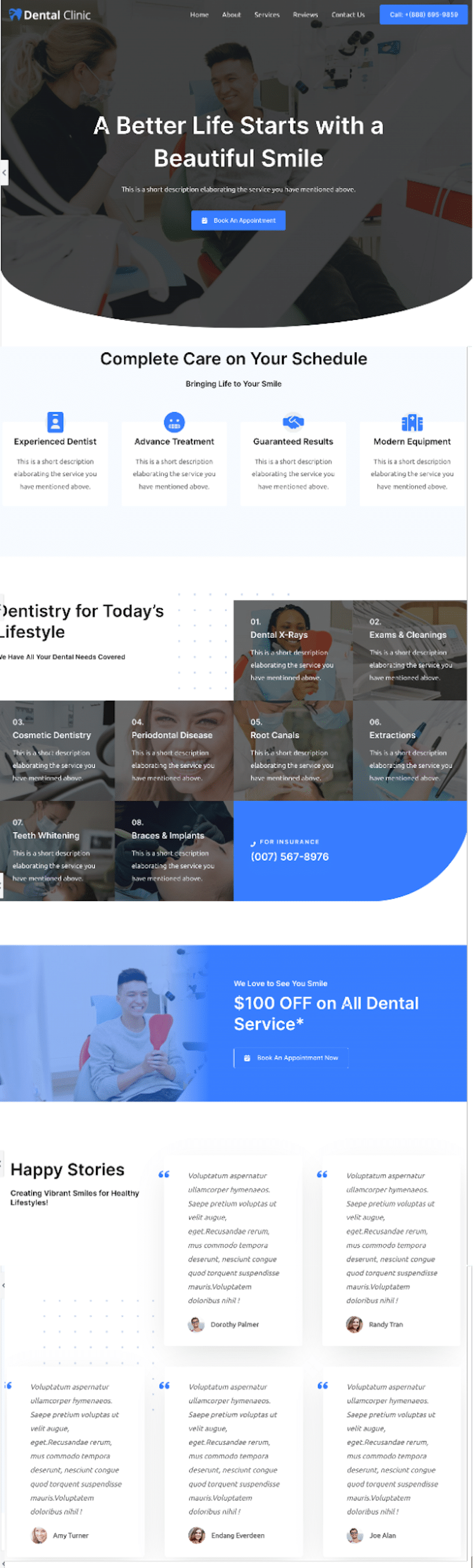 For the first category, we built a realistic test site using the WordPress Editor and we used the blocks to create a hero banner with a button, 5 testimonials with pictures, 1 call to action (full section with an image), 4 icons and text, 2 titles and 2 subtitles, and 8 services with pictures.