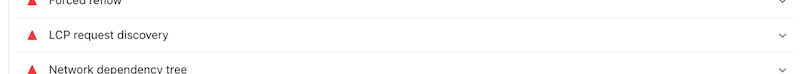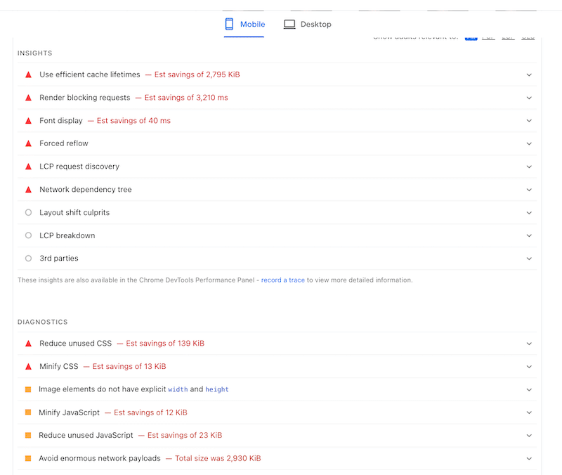 Additionally, there were a few issues flagged by Lighthouse, listed under the “insights” and “diagnostics” tab: