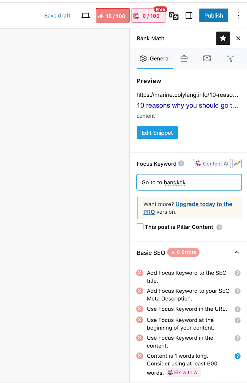 In the free version, you can optimize unlimited focus keywords, access Google keyword suggestions, mark pillar content, and even get internal linking suggestions. The built-in content analysis checks readability, keyword usage, and schema in real time.