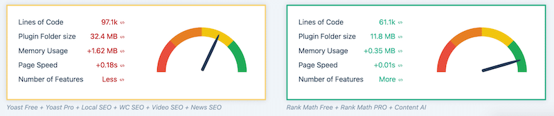 The comparison below shows that Rank Math is lighter and faster than Yoast SEO, even when both are paired with their premium add-ons. Rank Math uses fewer lines of code (61.1k vs 97.1k), has a smaller plugin size (11.8 MB vs 32.4 MB), and consumes less memory. It also has a negligible impact on page speed — just +0.01 seconds, compared to Yoast’s +0.18 seconds.