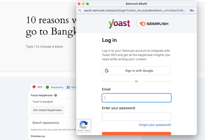 The Semrush integration (available in both free and Premium versions) connects Yoast to Semrush’s vast keyword database, giving you instant keyword suggestions directly in the Yoast SEO sidebar.